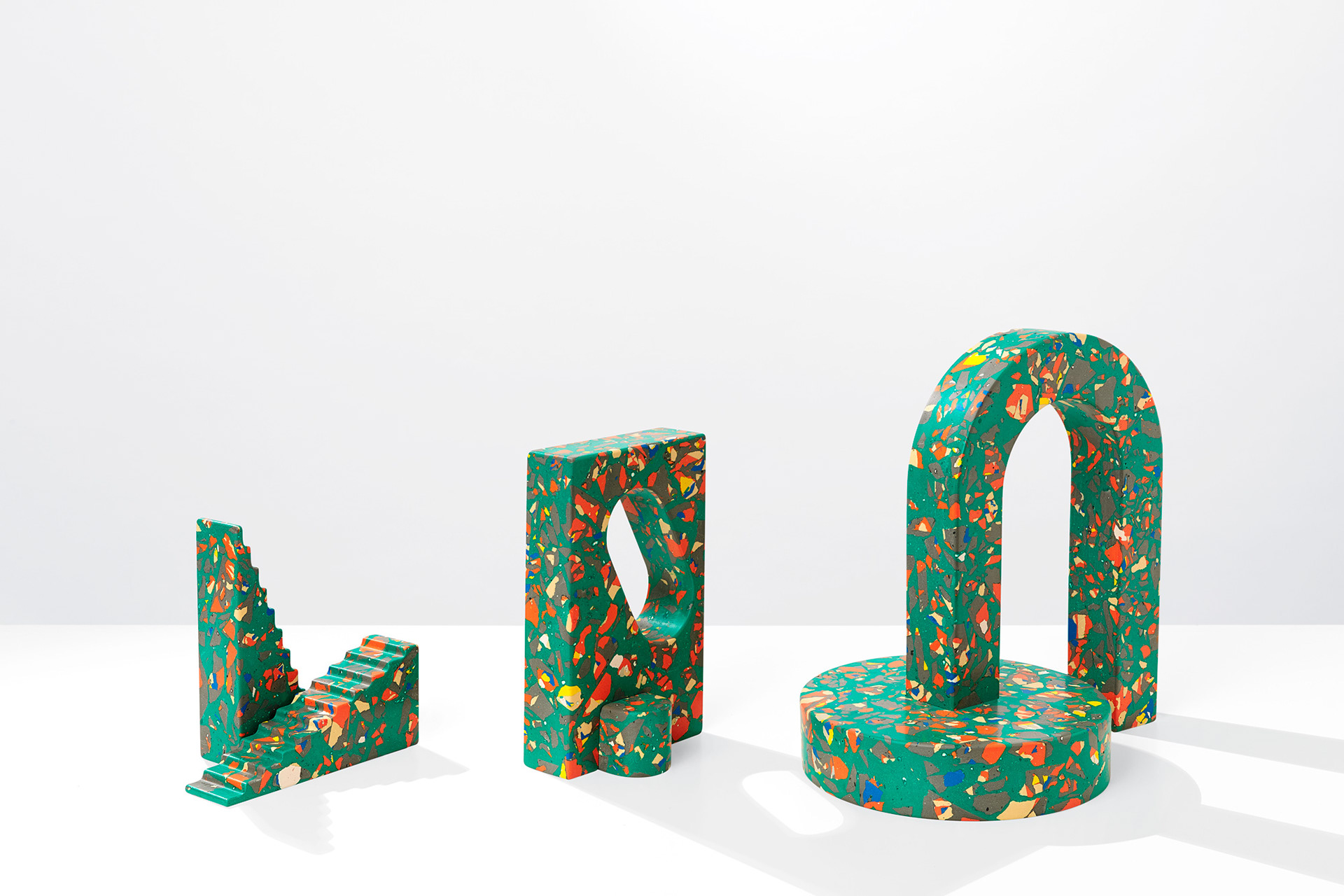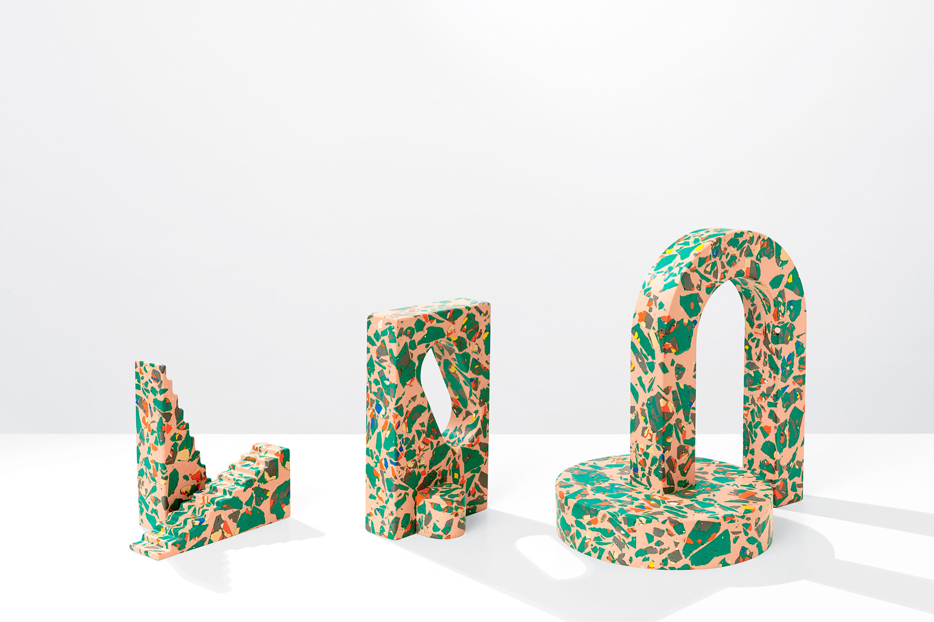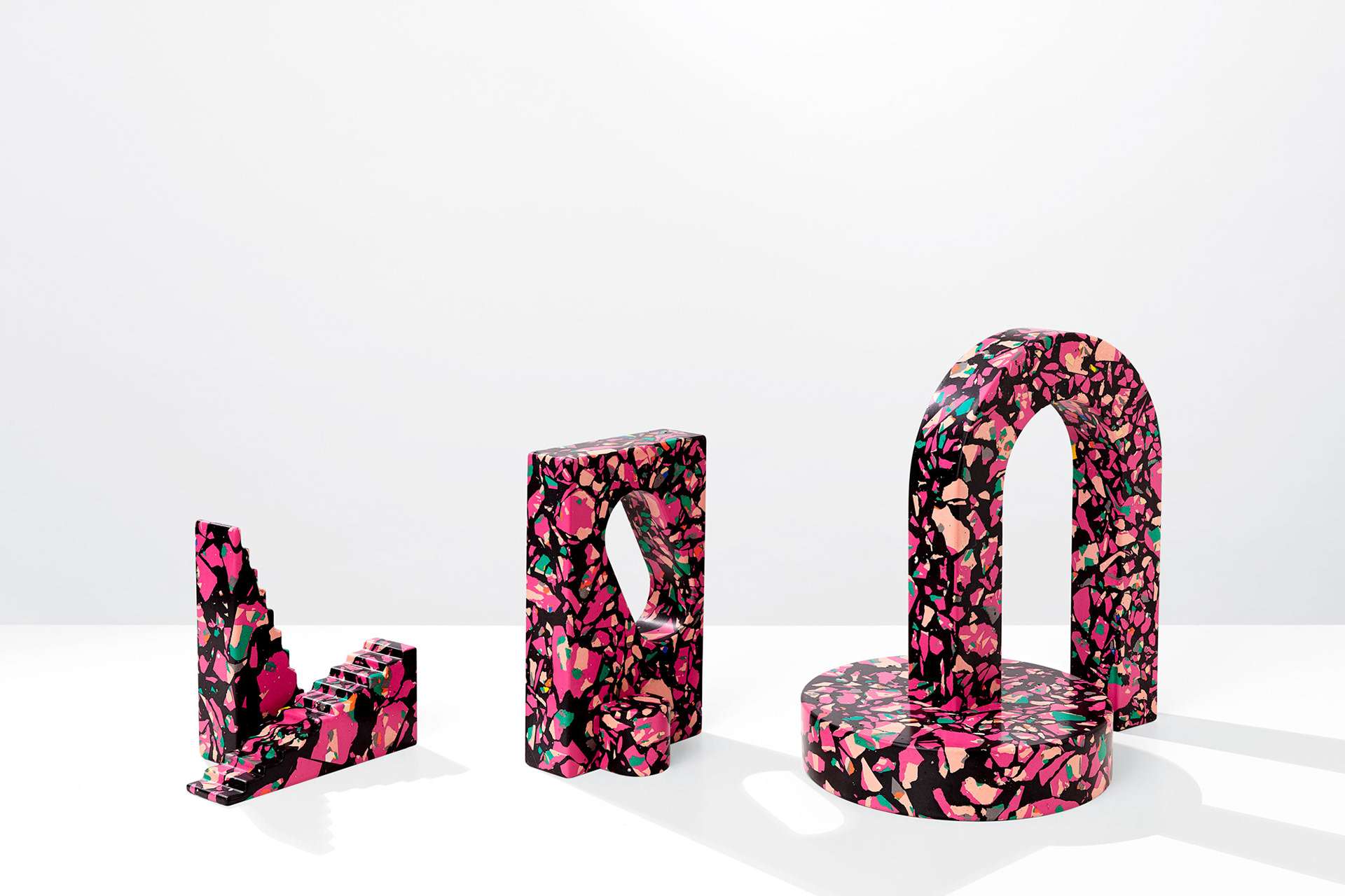 Polyspolia is a proposal for a new mode of production in which an object's material can be endlessly broken up and remade. Each of the objects in this edition are related – springing from the same core material which is shattered into fragments before being regrouped into a fresh composition. This is a process in which the waste from the production of the pieces can be infinitely incorporated into the next generation of objects.