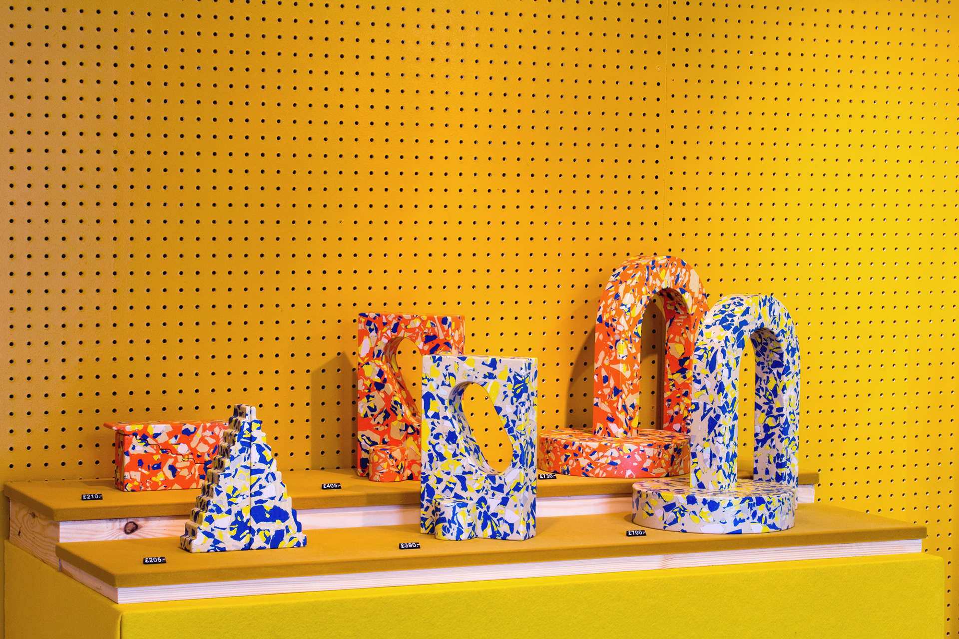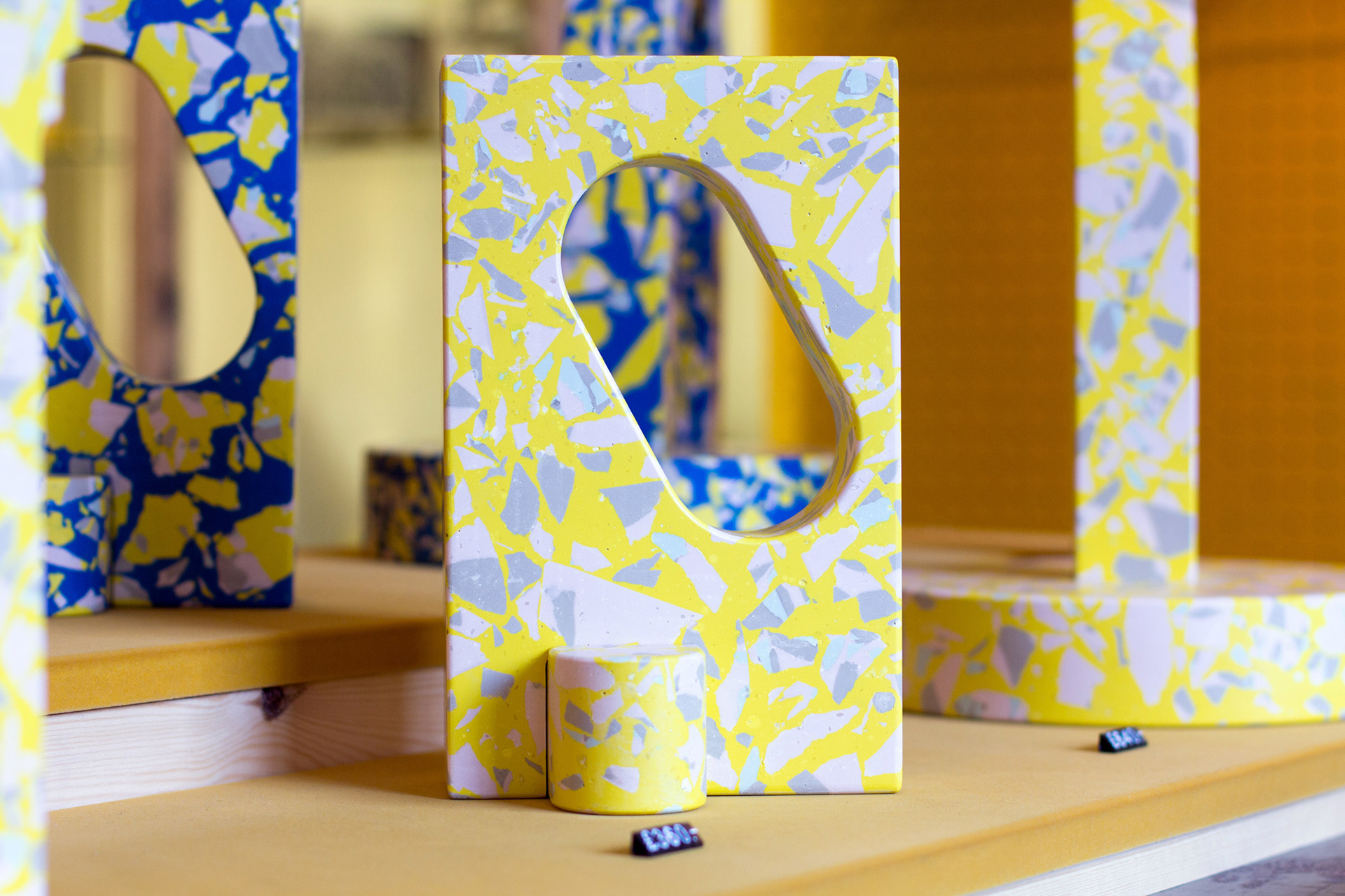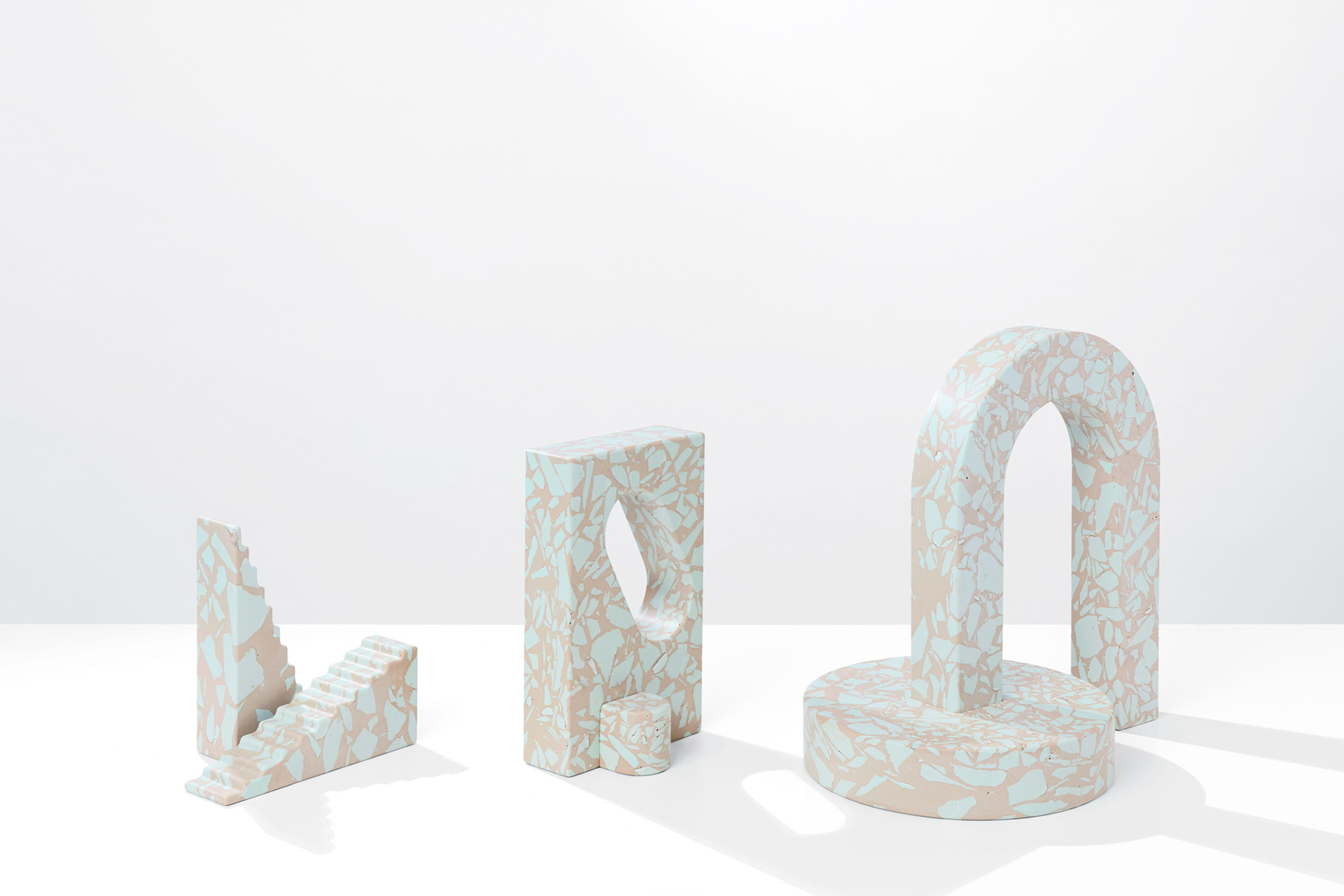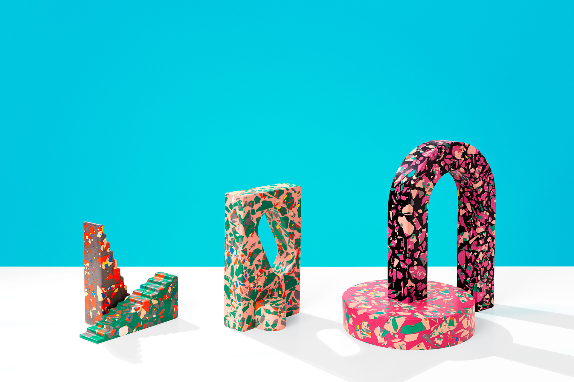 Polyspolia is a proposal for a new mode of production in which an object's material can be endlessly broken up and remade. Each of the objects in this edition are related – springing from the same core material which is shattered into fragments before being regrouped into a fresh composition. This is a process in which the waste from the production of the pieces can be infinitely incorporated into the next generation of objects.